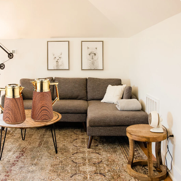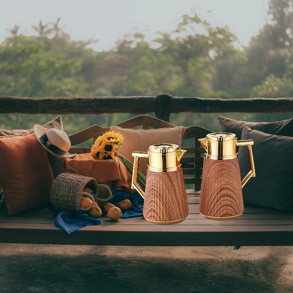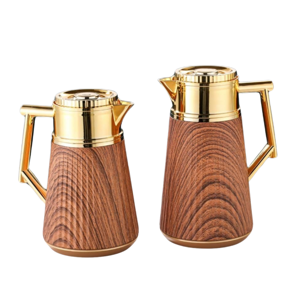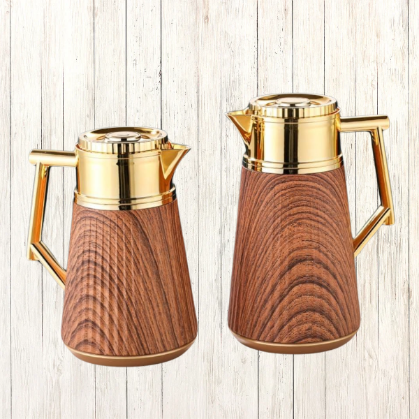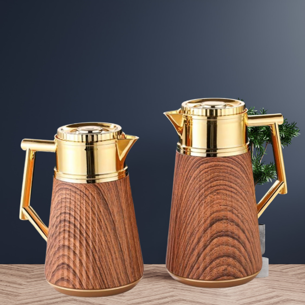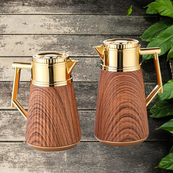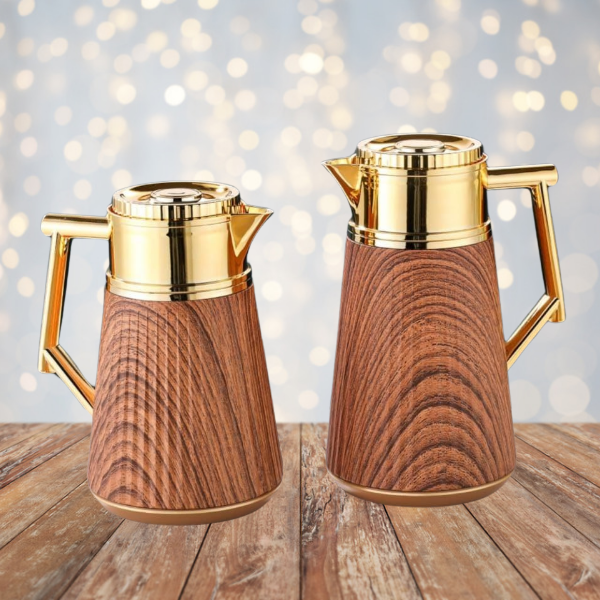 اطلبي الآن طقم ترمس ذهبي خشبي للشاي والقهوة من متجر بكم.