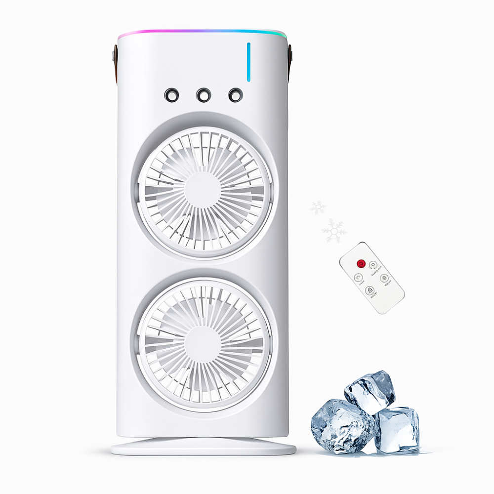 مروحة رذاذ مزدوج مع إضاءة LED وتحكم عن بُعد – تبريد متنقل وأنيق