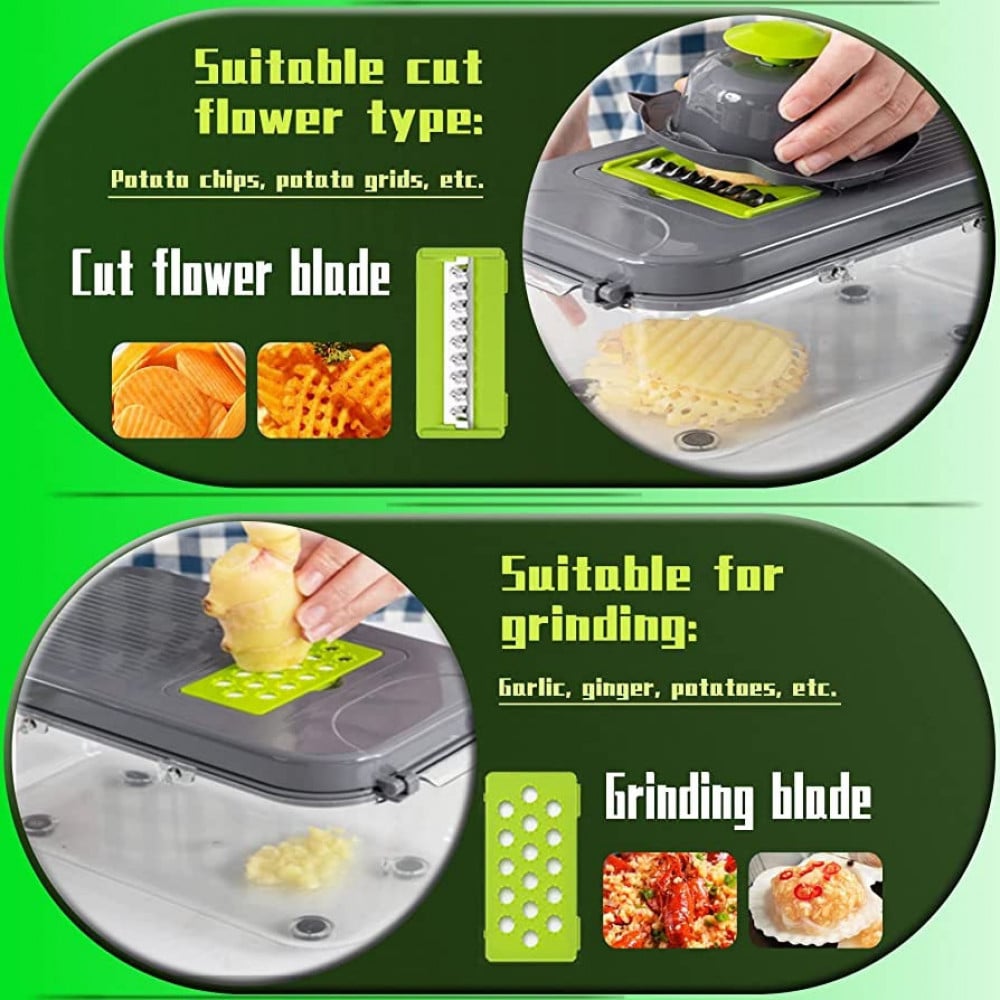 قطاعة الخضار المطورة 22×1، مرفق معها 13 نوع من الشفرات والقطاعات المختلفة، لطبخ أكثر مرونة.